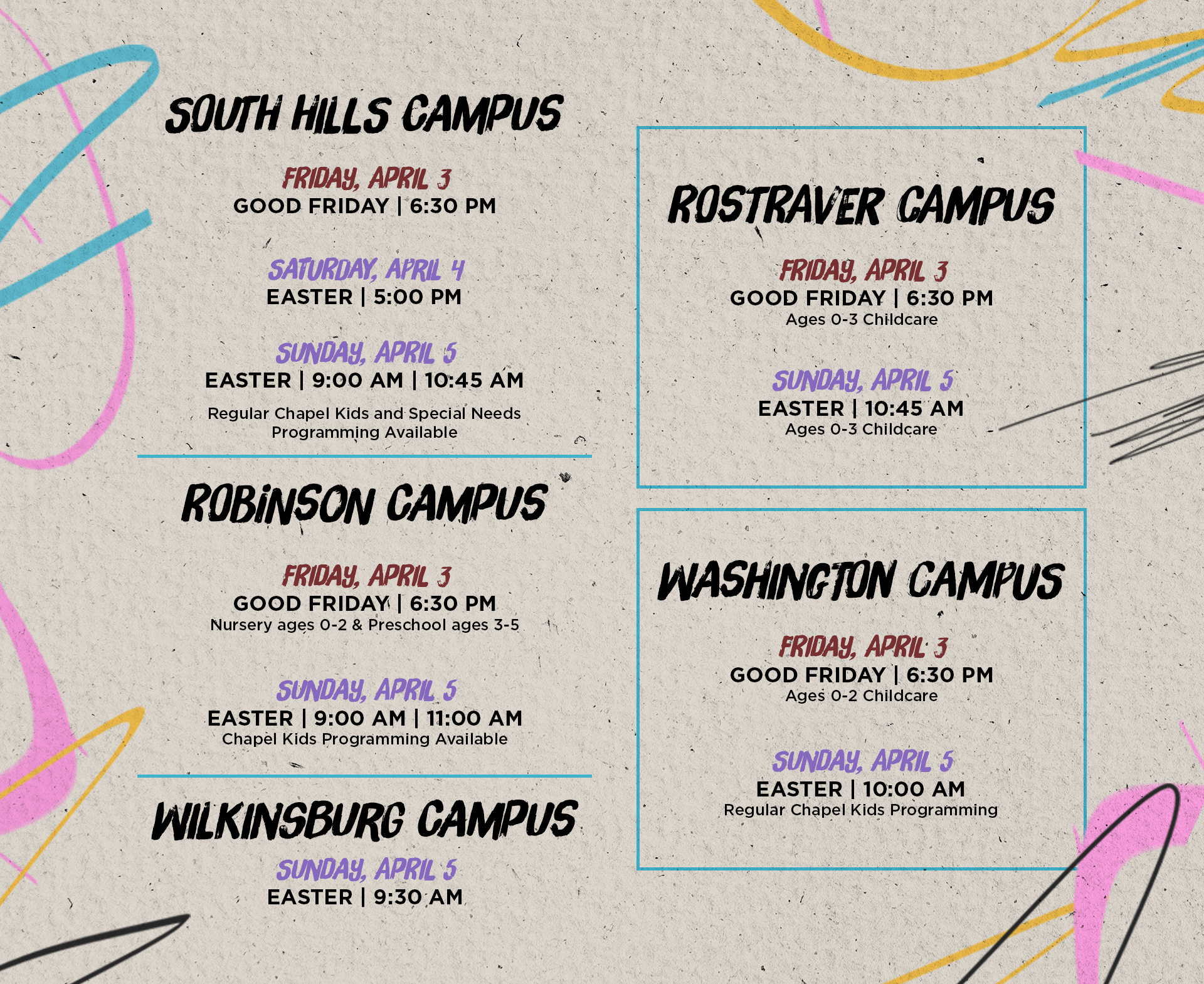See the graphic above to see what Chapel Kids offerings are at each of our campuses.