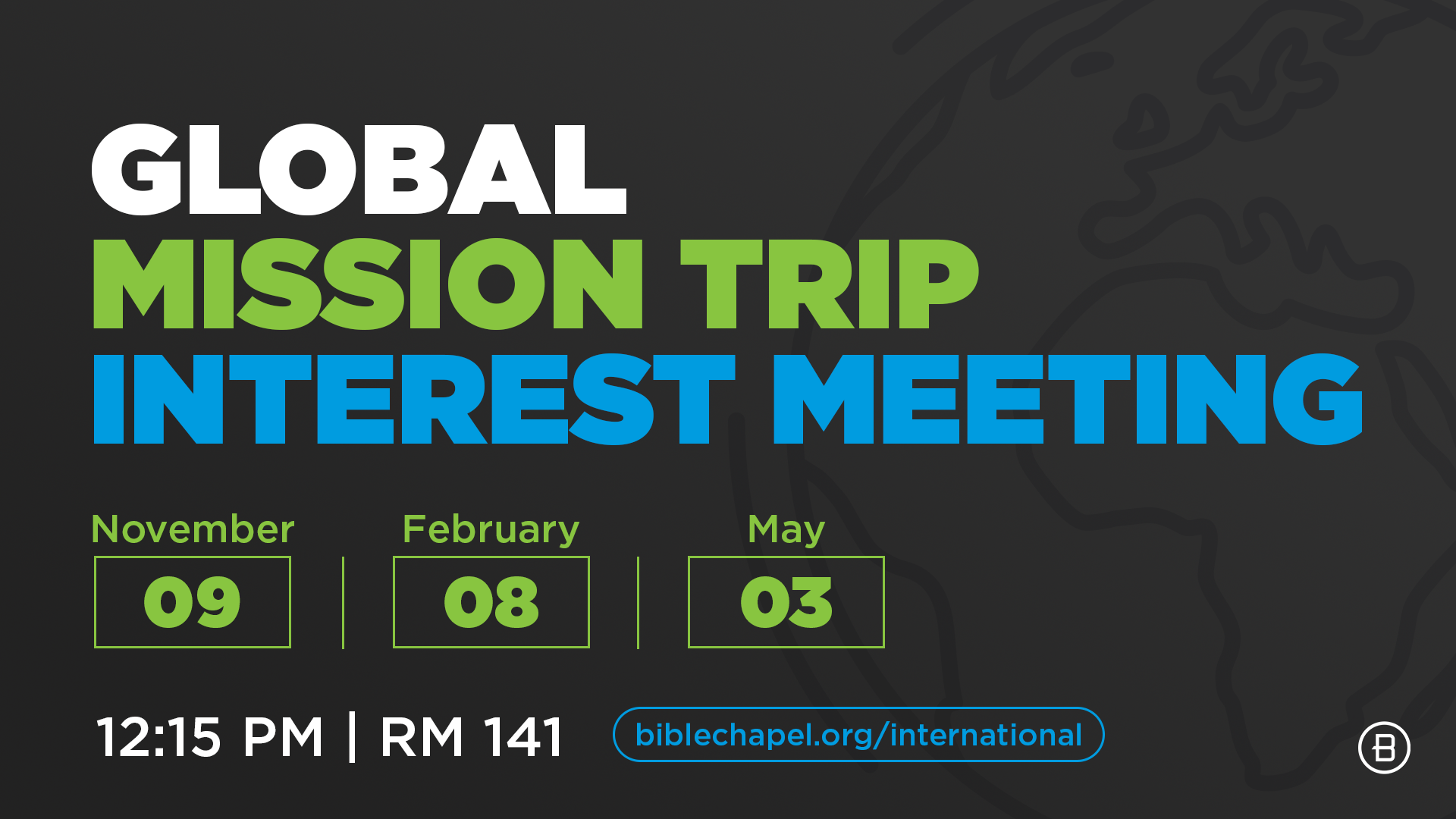 Have you ever wondered what it’s like to go on a global mission trip? Would you like to learn more about our 2025 and 2026 trips? Join us for a Global Mission Trip Interest Meeting where we will discuss our upcoming mission trips, answer your questions, and more. You can join us on November 9, February 8, or May 3 at 12:15 PM in RM 141 at our South Hills Campus!