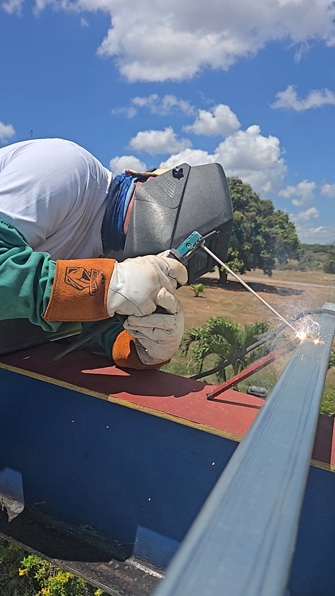 We then all went to the different projects and split into groups working on different stuff. Some guys where hauling all the old roof stuff away and bringing back new roofing stuff. A few of us where welding braces on the roof beams. A group of other guys where digging holes and cementing in benches and tables. One other group was working on ceiling in the small gym area and installing a AC unit. And some guys where grinding stuff for painting along with another guy cutting away a layer of cement that needed to be lowered for the new roof to fit properly.