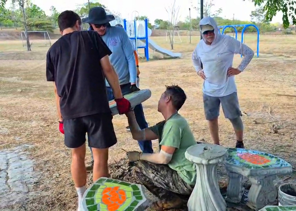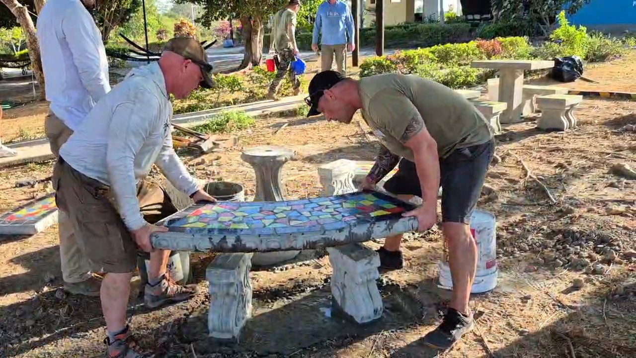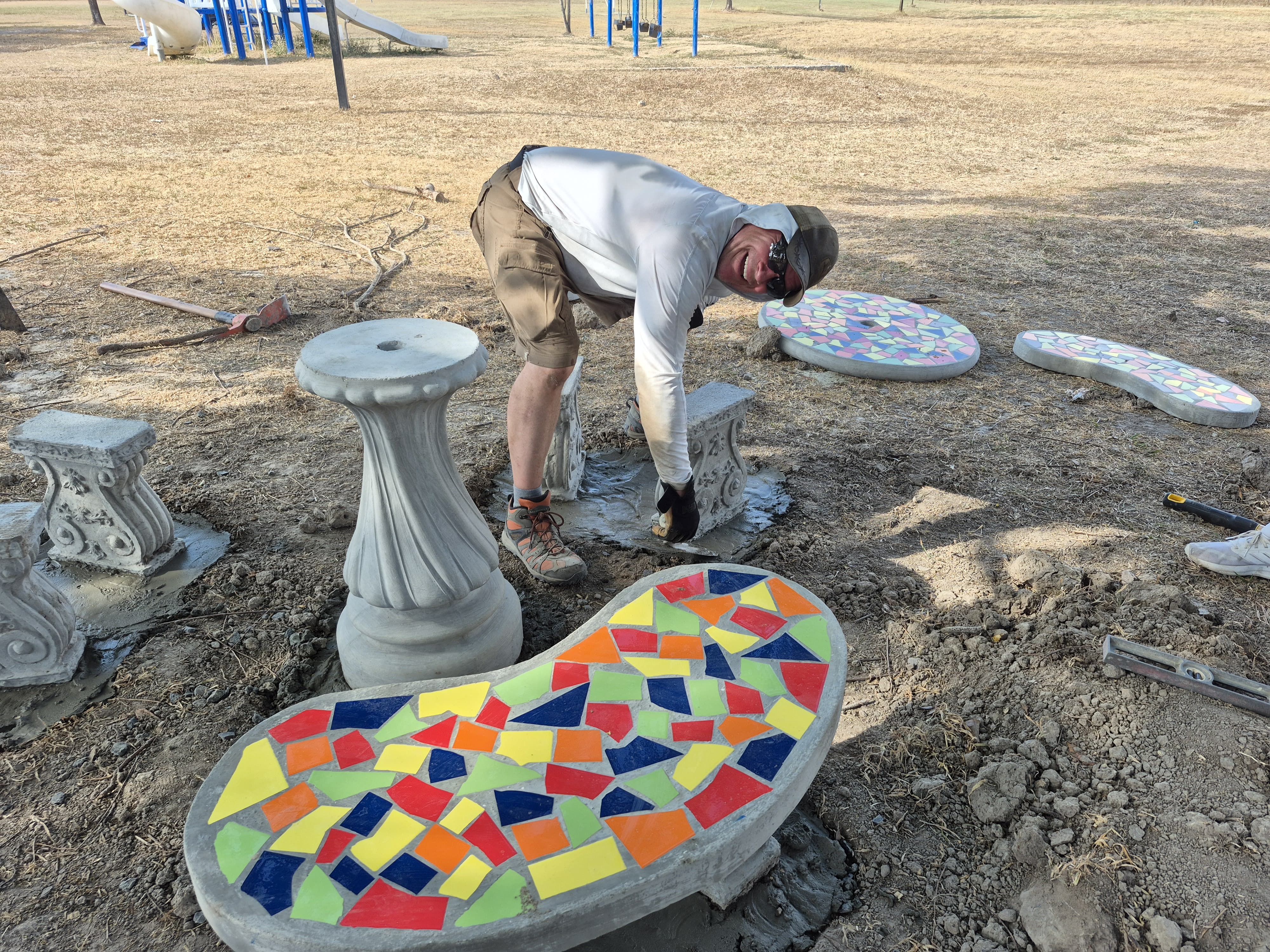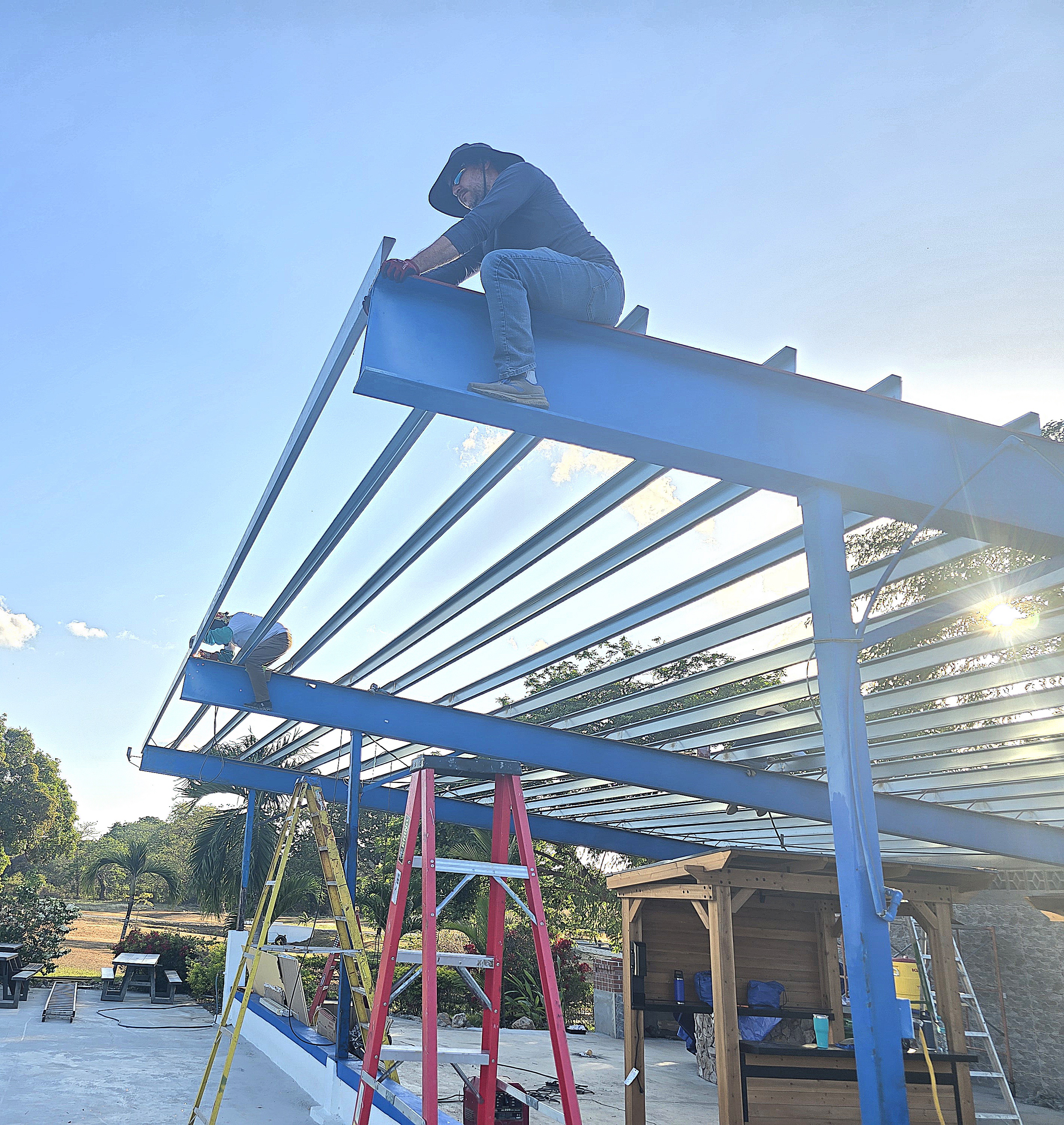 We hit a little setback today though around 9am with a power outage and had to stop doing stuff that involved power tools because the generator we had was not powerful enough to handle them all. So guys gathered together and worked on the projects that didn't need power tools. We went to lunch early and after a great lunch, we heard testimonies from the brothers on the team, Ryan and Adam, and prayed over them both after. God provided for us in a great way, because the power came back on around 3pm and we was able to finish the evening strong getting most of the welds done on 2 sections and the cementing of the benches and tables got finished.