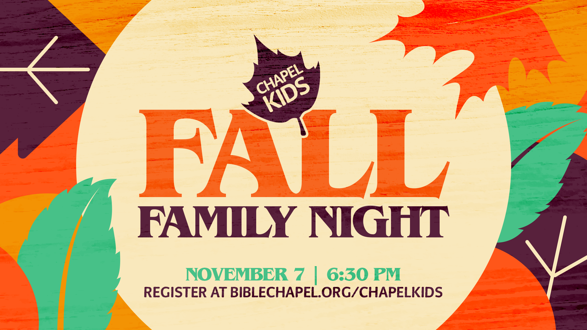 Chapel Kids Families, you're invited to our Chapel Kids Fall Family Night on November 7 at 6:30 PM!