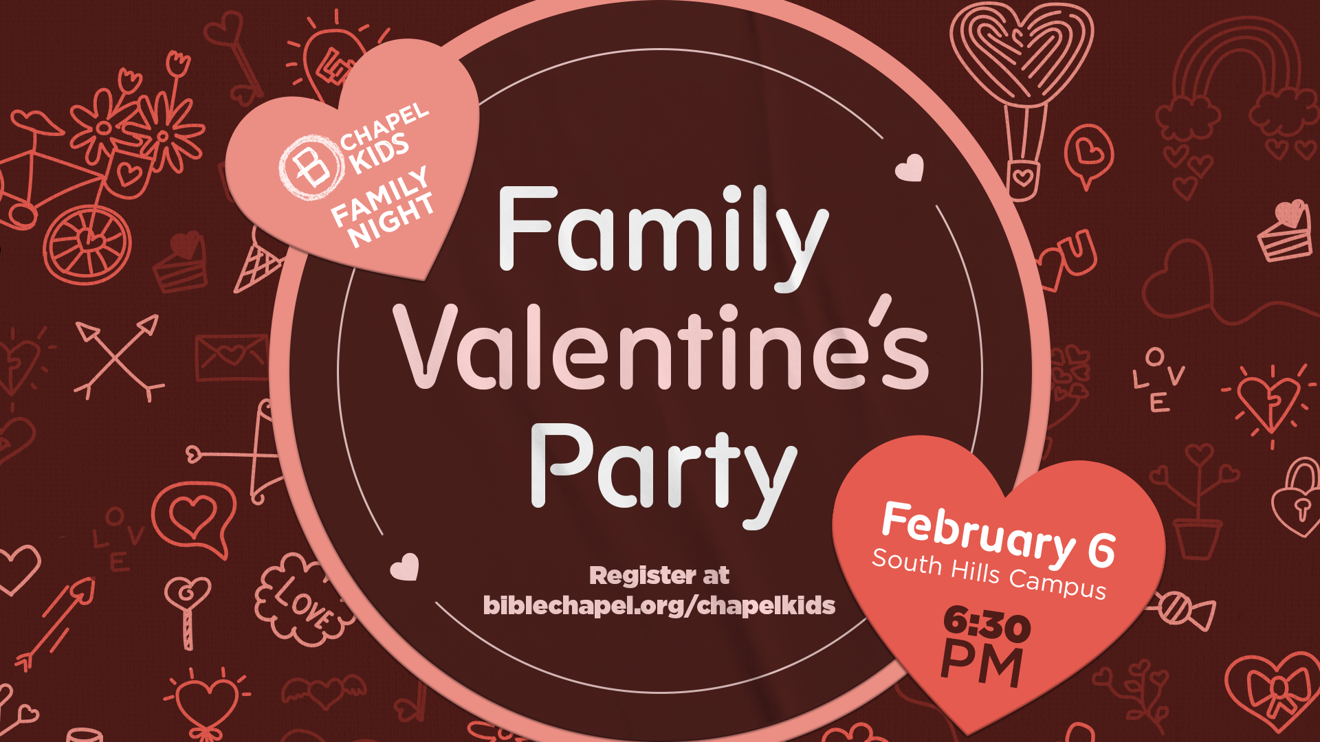 Chapel Kids families - we’re so excited to invite you to our Chapel Kids Family Valentine’s Party on February 6 at 6:30 PM! It’s going to be a fun night full of family fun activities! We’ll start with our family service before heading to the FLC for a yummy, Valentine's treat and fun party activities like crafts and Lego building!