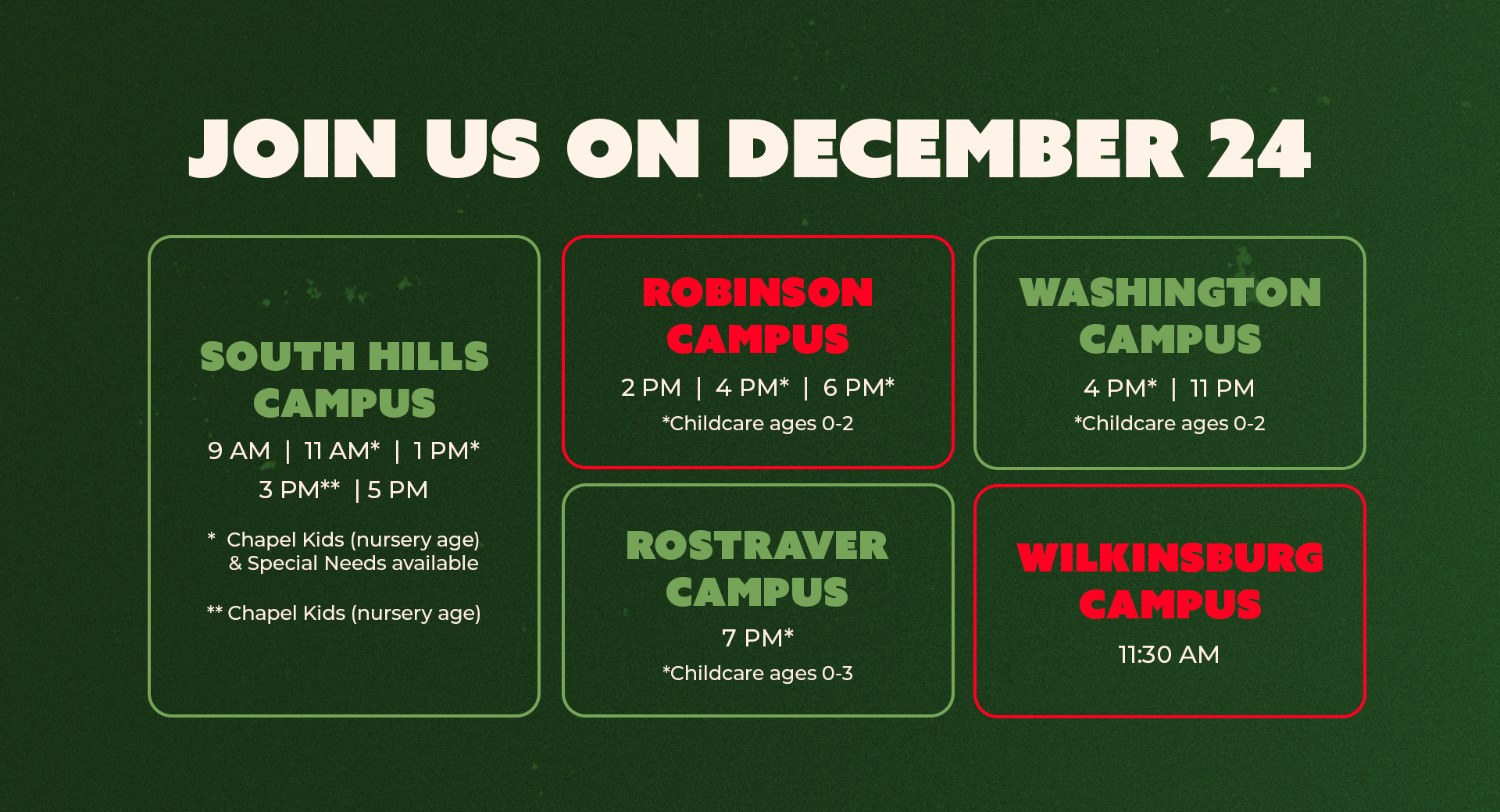 Join us at one of our campuses across the Pittsburgh area to celebrate Christmas Eve as a part of our church family!