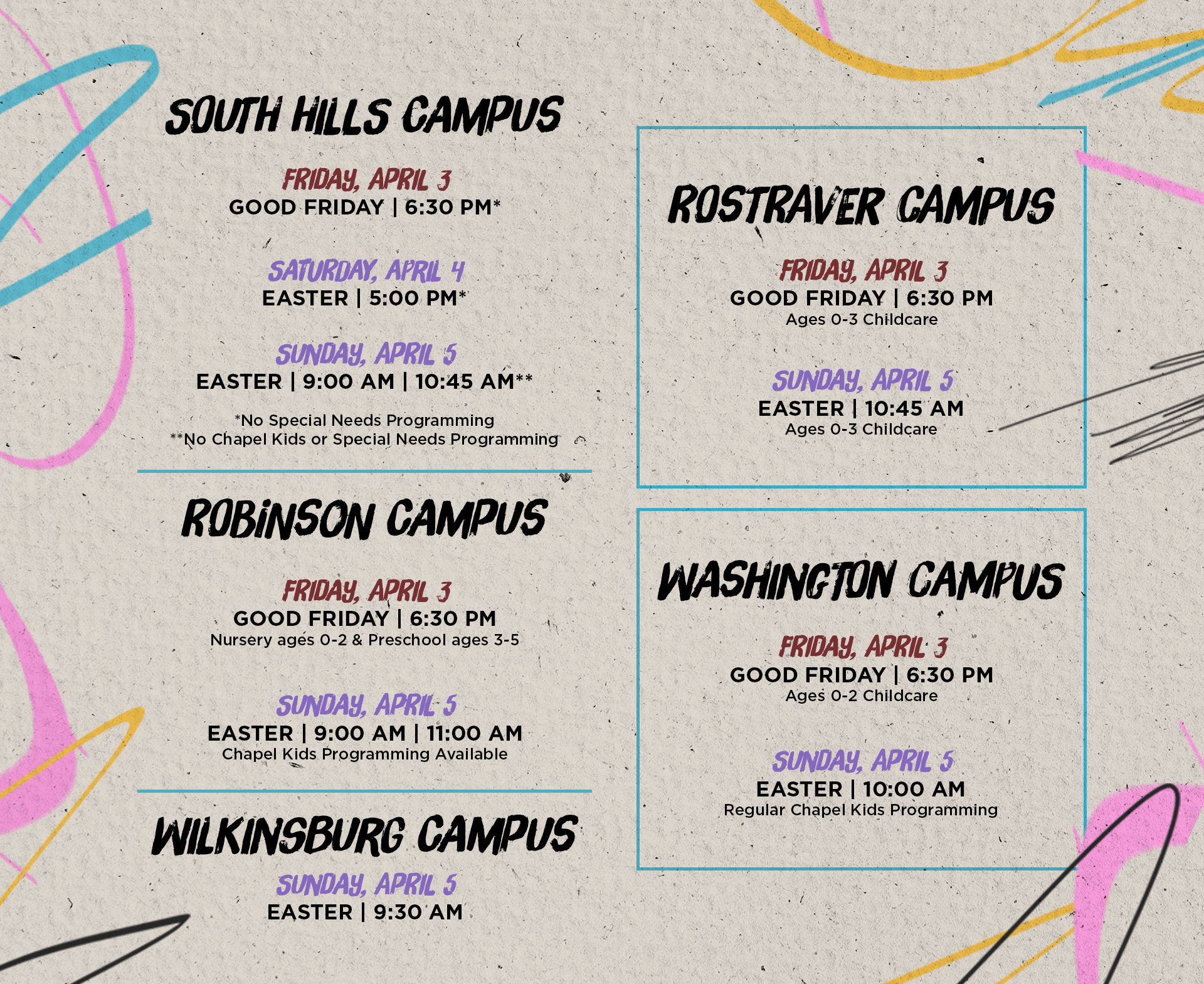 See the graphic above to see what Chapel Kids offerings are at each of our campuses.