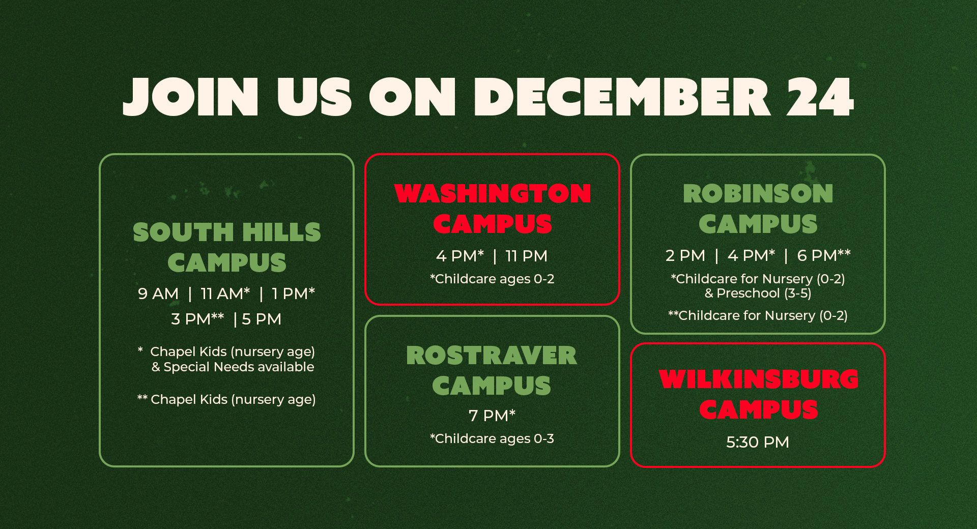 Join us at one of our campuses across the Pittsburgh area to celebrate Christmas Eve as a part of our church family!