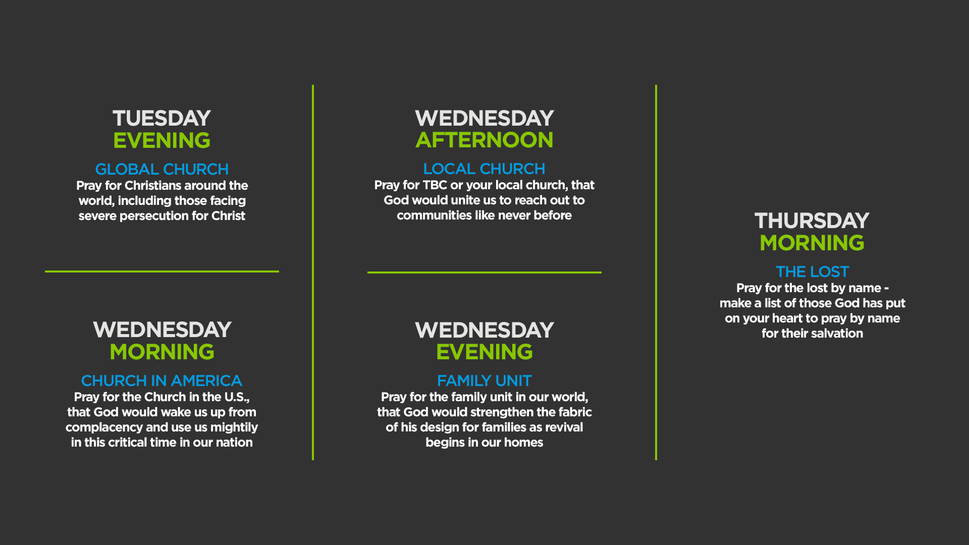 Whether you fast for the full 36 hours, for one meal, or not at all due to physical/other limitations, please make it a priority to join us in prayer for each of the five prayer sessions.